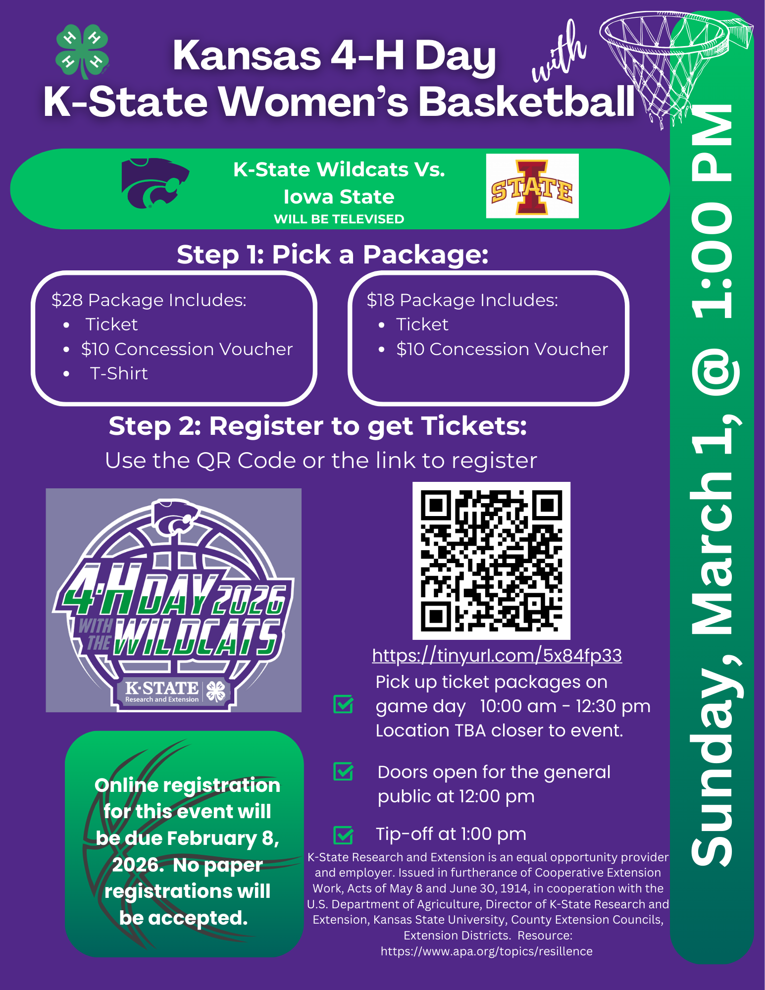 Kansas 4-H and K-State Admissions are partnering to help youth and their families confidently navigate the college journey. Through a series of interactive sessions, participants will gain a clear understanding of the college preparation process, explore strategies for financing education - including scholarships, loans, and other resources - and learn how students are supported both academically and personally, from both the student's and parent's perspective. Sessions will also focus on "beginning with the end in mind," equipping youth with tools to prepare for life after college, create personalized plans, and take ownership of their future. In addition, open office hours will provide families with direct access to experts for questions and guidance, ensuring every student feels prepared and empowered for success. These sessions will be targeted at 4-H parents of juniors and seniors in high school; 4-H members are also encouraged to attend. Sessions will not be recorded to maintain the privacy and confidentiality of participants. Registration information will be emailed directly to families via 4-H Online. For questions, please email the State 4-H Office at kansas4h@ksu.edu.
